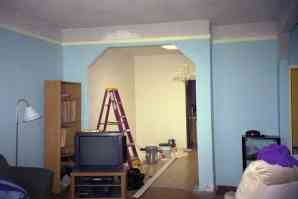 006_6.JPG -- Dining Room - Measuring and painting crown moulding. It has a neat dentil profile. Installation will happen later, because it is pretty complex.